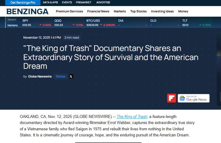The momentum behind The King of Trash continues to grow. Following the powerful pre-screening earlier this month, the documentary has now been featured across multiple major news platforms nationwide. From finance publications to global media outlets, the story of David Duong and his family is resonating far beyond the Vietnamese community and into the mainstream.